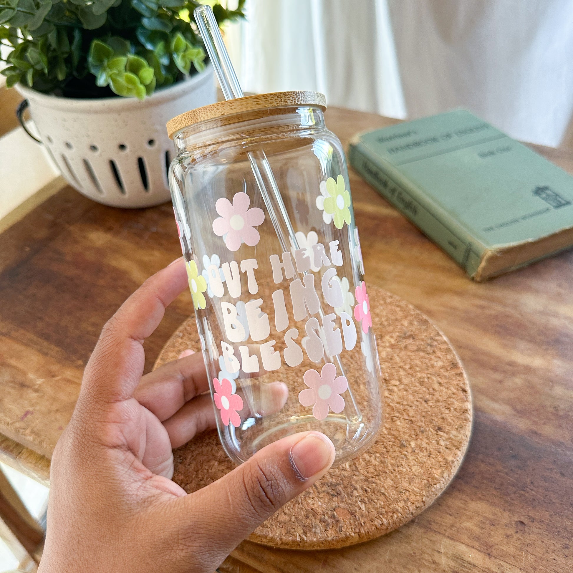 Online orders come with bamboo lid and clear glass straw included. If Plastic is selected, a plastic straw will be included instead of glass. Glass Tumbler, Cute Glass Cup, Iced Coffee Glass, Retro Cup, Daisy Cups, Iced Coffee Cup, Floral Tumblers, Flower Cups